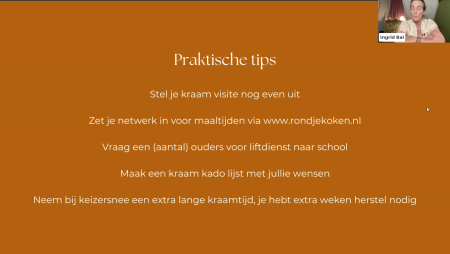 minuut 20:40 → bespaar geld en maak een kraamwensenlijstje; vraag (een bijdrage voor) massages (massages zijn geen luxe maar noodzaak voor herstel!), voor een kraamfeest na de 40 dagen kraamtijd of voor ondersteuning door een doula